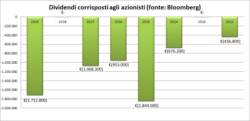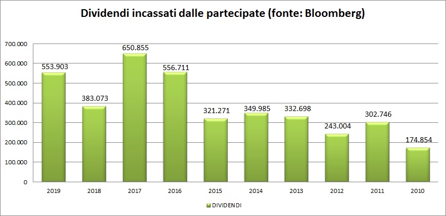 Dal 2010 a fine 2019 la somma dei dividendi incassati e le plusvalenze realizzate ammonta a circa € 23,7 mln.