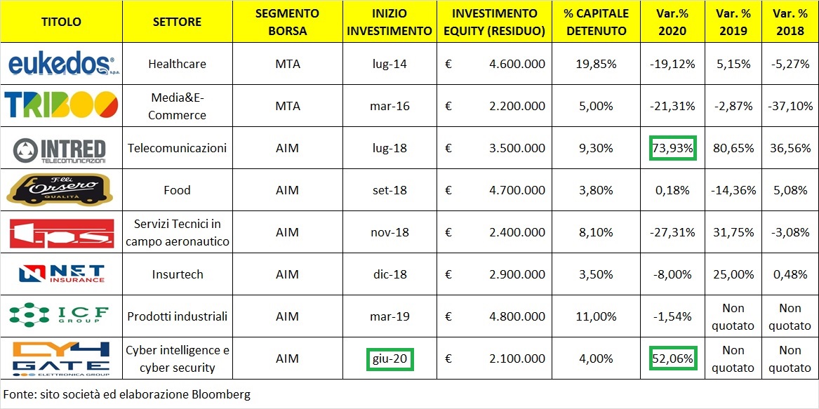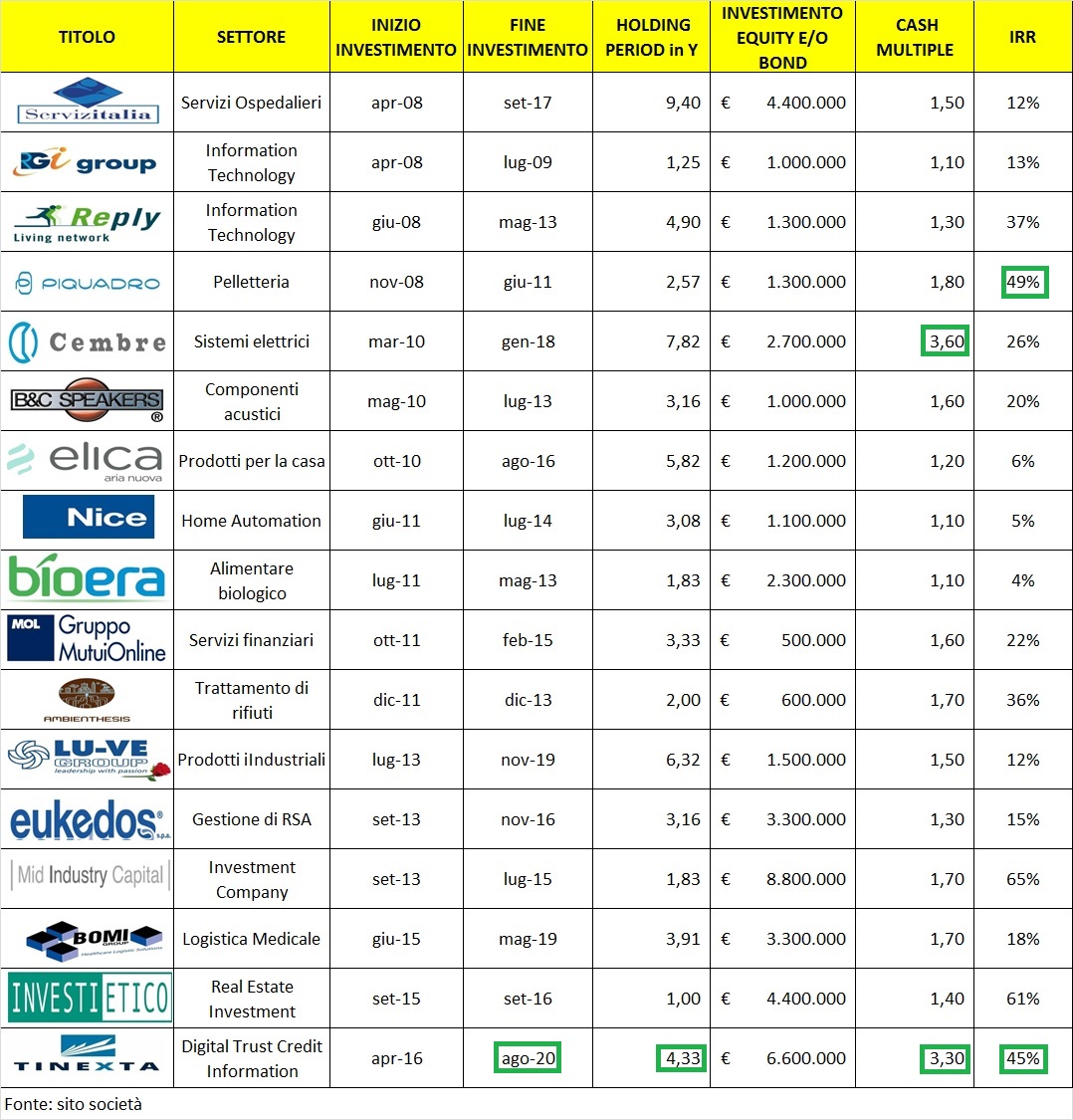 Tra le operazioni più interessanti non si può non citare TINEXTA, dismessa ad inizio del mese di Agosto: l’IRR dell’investimento è stato pari al 45% mentre l’incasso è stato 3,3 il valore dell’investimento iniziale.