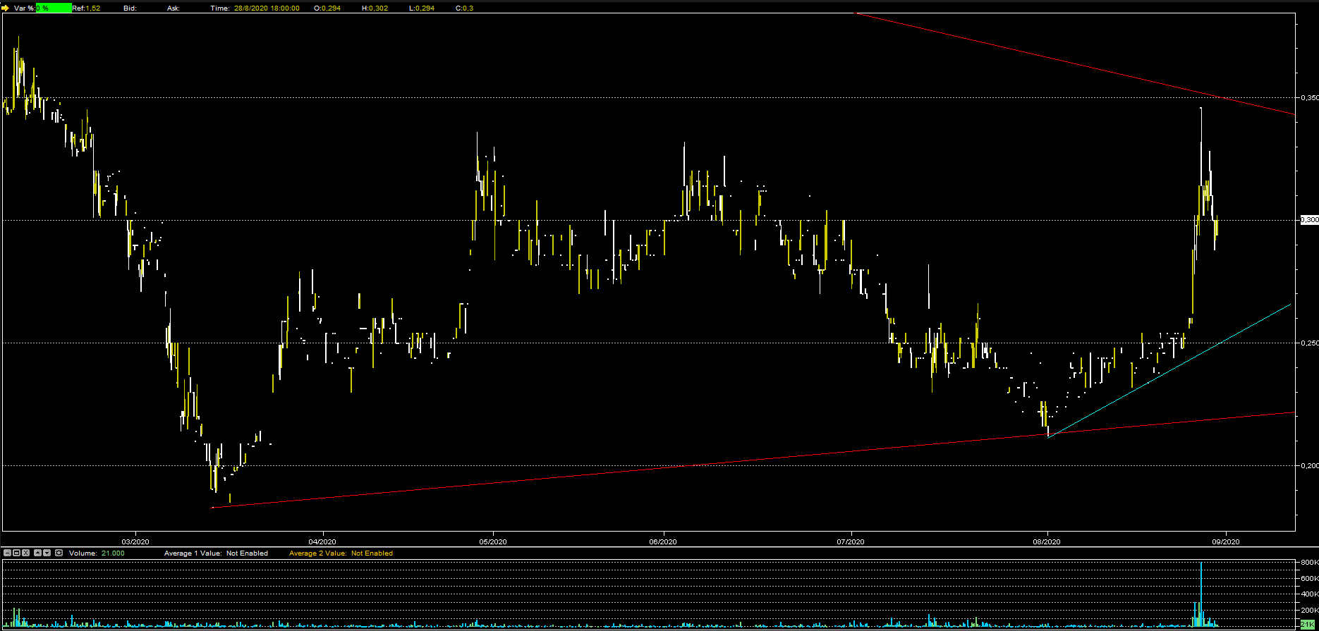 - Sforamento del canale ai 0.25€, notare l'incremento dei volumi di trading, segnale inequivocabile dell'incrementarsi dell'attenzione sulla preda.