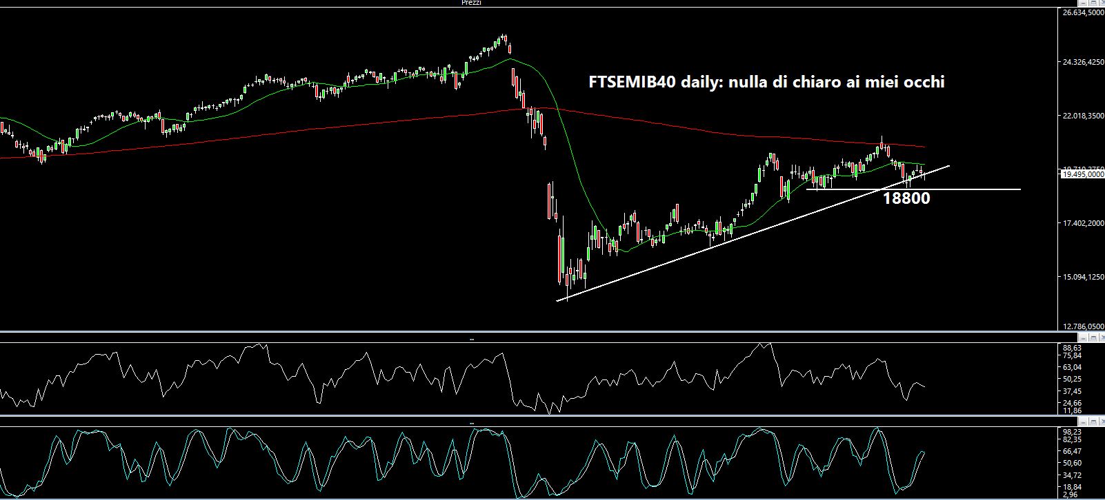 Francamente fatico a trovare un quadro grafico "lineare" sul daily, dal momento che la situazione si presenta molto "choppy" in questa fase: lateralità in su ed in giù. Quello che c'è di buono è che per il momento i dati trimestrali sono terminati e se ne riparlerà fra un paio di settimane....ma mi domando: se nemmeno i dati hanno sbloccato la situazione allora cosa ci vuole? Finchè non si torna sopra i 20000 per qualche seduta i trades saranno da mordi e fuggi (e possibilmente se fuggi non ferirti).