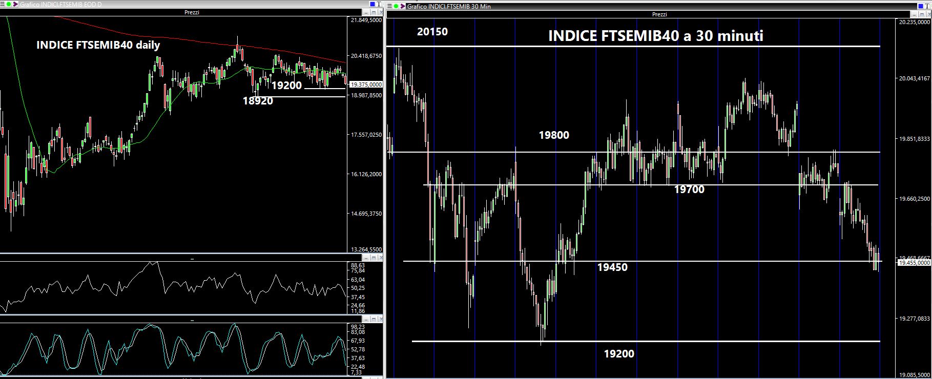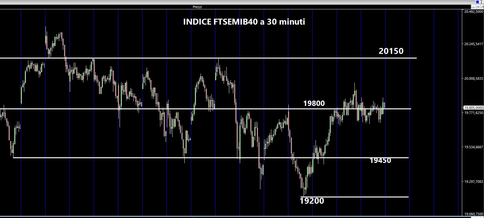 Prima di tutto notiamo che i 19800 hanno costituito un punto di supporto mercoledì ed un punto di resistenza il giovedì: dopo una congestione sotto il suddetto livello nel giorno di scadenze l'indice è stato nuovamente "calamitato" a 19450 punti, dove ha poi chiuso millimetricamente l'ottava. Se i livelli costituiscono punti di supporto e di resistenza, i volumi sono fondamentali per assumere posizioni long o short. Il problema è che mancano completamente, almeno in questa fase. E come ho più volte detto su queste colonne, quando questo si verifica ci possono essere dei movimenti netti e decisi all'orizzonte. Naturalmente non è una cosa che si legge sui libri ma che deriva dalla mia esperienza o se preferite dalla mia sensibilità.