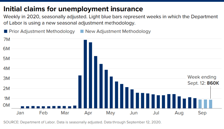 Rallentano leggermente le nuove richieste di sussidi di disoccupazione nella settimana che si riferisce dal 10/09/2020 al 17/09/2020; sono 860 mila le nuove richieste, sempre un po' sopra le stime che speravano in un dato di 850 mila unità, ma in netto miglioramento rispetto alla settimana precedente dove si registravano 893 mila richieste.