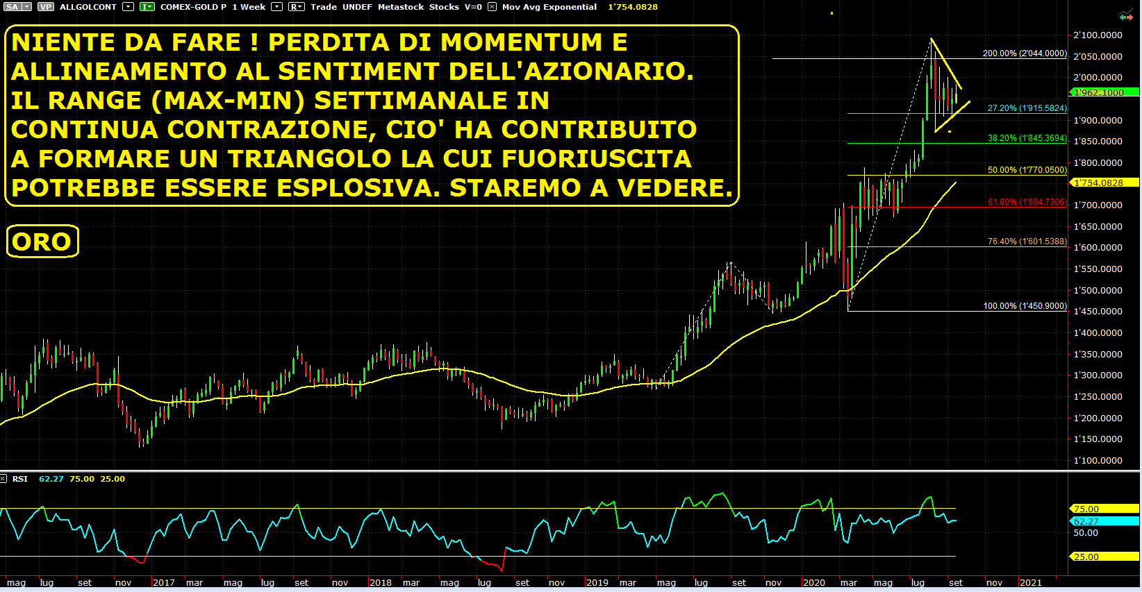 A livello operativo notiamo una debolezza di fondo della commodity con il range delle candele (max-min settimanale) che si sta assottigliando sempre più formando un triangolo con base il massimo ed il minimo dell’ultimo periodo la cui fuoriuscita potrebbe risultare esplosiva, vedremo se al ribasso o al rialzo. Al ribasso tiene molto bene il primo supporto posto in area 1915 $/oz. (ritracciamento del 27,2% dai massimi storici), al rialzo è essenziale la riconquista e conferma di area 2000 $/oz. per poi tentare un attacco ai massimi storici. Per quanto riguarda il nostro investimento sull’ETF (PHAU) con la strategia “The Challenger” rimaniamo anche noi in attesa di eventi. Da valutare, in caso di una correzione più profonda, l’acquisto di una ulteriore posizione.