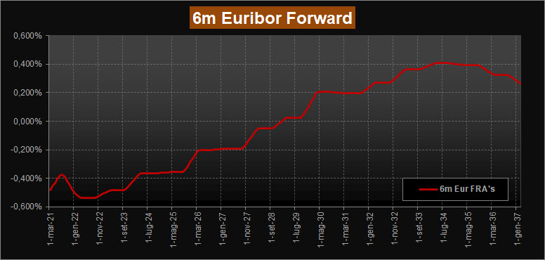 La lettura della ZC-Yield Curve, questa settimana, mostra un deciso restringimento dei rendimenti su tutto il tratto di curva, compatibilmente con le prospettive ricavate dalle decisioni della BCE nell’ultima riunione. E così abbiamo ora rendimenti negativi sino alle scadenze 2037; la scadenza a 10 anni, ormai con rendimento negativo da tempo, si porta in area -0,24% mentre la scadenza trentennale vira in negativo e si porta a -0,02% risetto allo 0,09% della scorsa rilevazione. Si modifica leggermente anche la forma della curva, che pare accentuare la ripidità, soprattutto nel tratto breve-medio, per poi tornare con rendimenti decrescenti dalla scadenza 2044; la curva esprime ora il massimo rendimento poco sopra area 0,01% in contrazione di oltre 10 bps rispetto alla scorsa analisi. Mossi anche i forward su Euribor 6 mesi, che sul tratto a lunga scendono ora verso area 0,30% e con il tratto a breve che scivola leggermente verso area -0,55%.