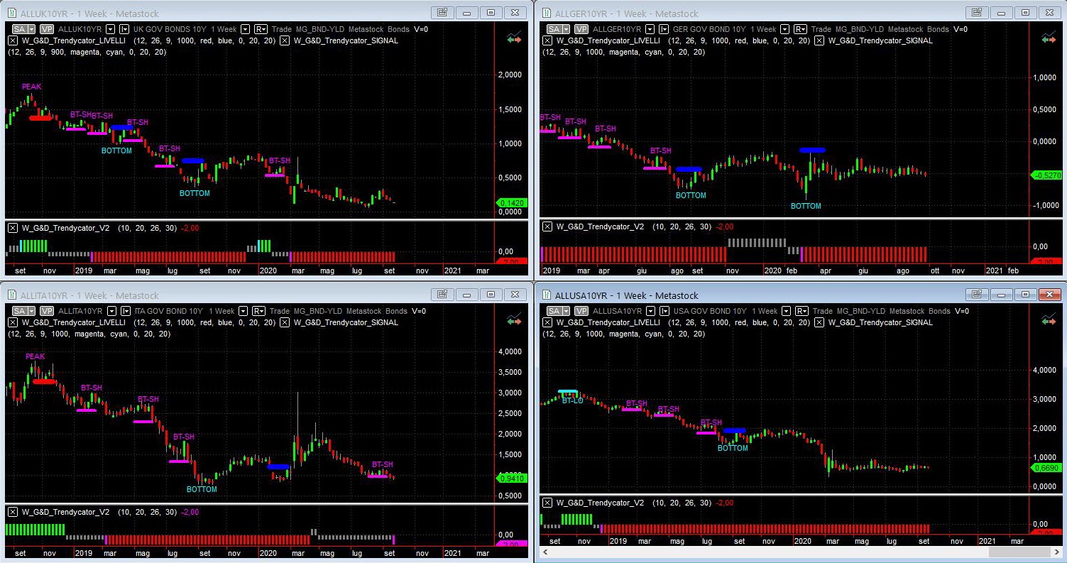 Osservando – a livello di analisi integrata – le curve dei rendimenti dei principali benchmark decennali notiamo su tutte le aree le dinamiche osservate nell’analisi della ZC Yield Curve, con il quadro di rendimenti in contrazione che si va rafforzando. Il quadro generale presenta quindi sempre rendimenti incollati sui minimi, con Trendycator confermato SHORT sull’area UK, con i rendimenti ora su nuovi minimi di periodo in area 0,14%. Nulla di nuovo per il BUND, con il modello Trendycator stabile sullo SHORT e con il rendimento del decennale tedesco che ora si porta sotto area -0,50% interrompendo la fase laterale tra -0,50% e -0,40%. Momento magico il nostro Btp, con i rendimenti che restringono ancora a sono ora sotto l’1% con Trendycator che cambia stato e diventa SHORT; migliora anche lo spread ora in area 134 bps. Più stabile l’area USD, i cui rendimenti proseguono l’altalena nel trading range tra area 0,60% e area 0,70% e con Trendycator sempre SHORT.