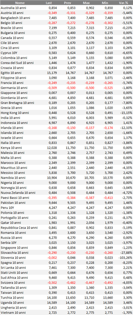 Analisi sotto forma di ranking dei bond governativi mondiali con qualunque rating. In alcuni casi, per alcuni emittenti o per alcune valute, il rapporto rischio/rendimento di questi bond può essere anche piuttosto speculativo. Il ranking considera i bond benchmark decennali in tutte le valute di emissione.