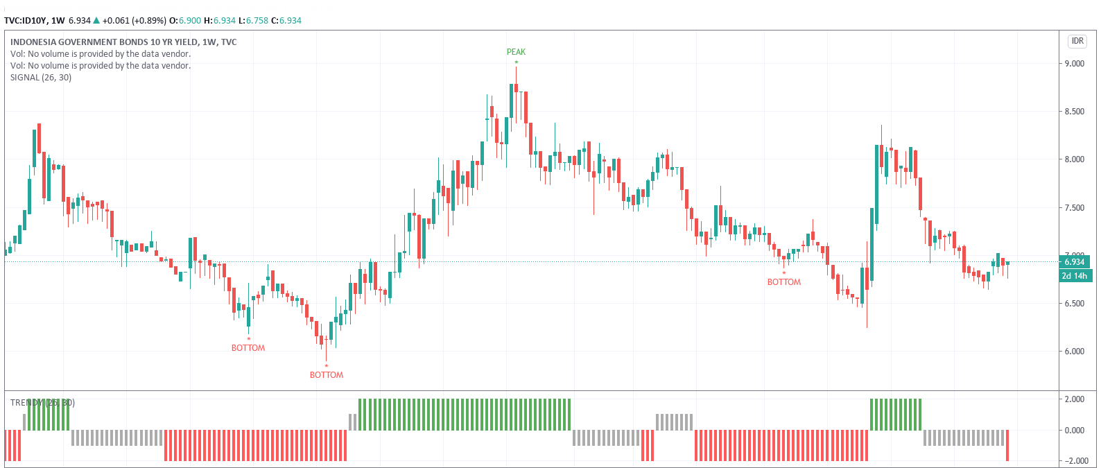 Torniamo quindi alla nostra analisi sui bond governativi indonesiani e vediamo che l’impostazione tecnica in base al modello Trendycator è potenzialmente molto interessante. Il modello infatti è appena entrato in conformazione SHORT, dopo che i rendimenti hanno confermato la violazione del supporto posto al 7% di rendimento. Il pullback verso quel livello pare ora esaurito e l’evidenza Trendycator indica un potenziale di ripresa di discesa per il rendimento del governativo indonesiano.