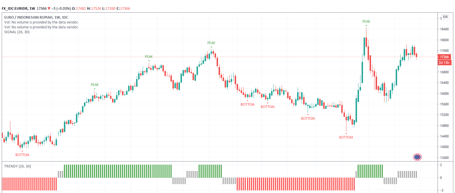 Per ciò che concerne il cambio EUR/IDR la situazione è stato NEUTRAL in base al Trendycator, con il cambio che dai massimi in area 18.000 è crollato sino ai 15.600 per poi rimbalzare agli attuali 17.200 circa, sancendo il cambio di impostazione del modello da LONG a neutrale.