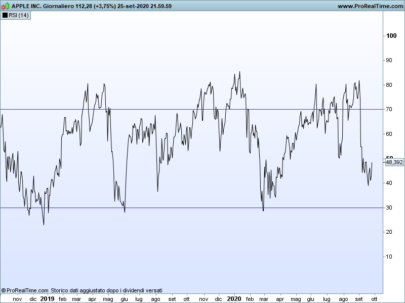 I rating decretati dai “tool” finanziari sanciscono un “buy” sia da parte di chi è trader sia di chi è investitore di lungo periodo. Cerchiamo allora di utilizzare un oscillatore che possa fotografare bene lo stato di momentum utile a individuare le fasi di eccesso del mercato: utilizziamo al proposito l’Rsi (Relative Strenght Index). Il titolo si è avvicinato a metà settembre all’ipervenduto, occasione eccellente di entrata ma nelle ultime sedute ha reagito. Si noti come il prevalere delle fasi di ipercomprato (oltre quota 70) sulla periodicità di 500 sedute (grafico sotto) testimoni la salute di Apple. Passando invece a un Rsi a 7 periodi il livello di ipervenduto a 30 è già stato toccato, sebbene in questo caso il riferimento vada abbassato più correttamente a 20. In sintesi la misura della forza è ancora favorevole ma su un’improvvisa e forse inattesa – seppur possibile - discesa nell’area dei 93-94 $ (contro la chiusura a 112,28 di venerdì) il click del “buy” diventerebbe ancor più inesorabile.