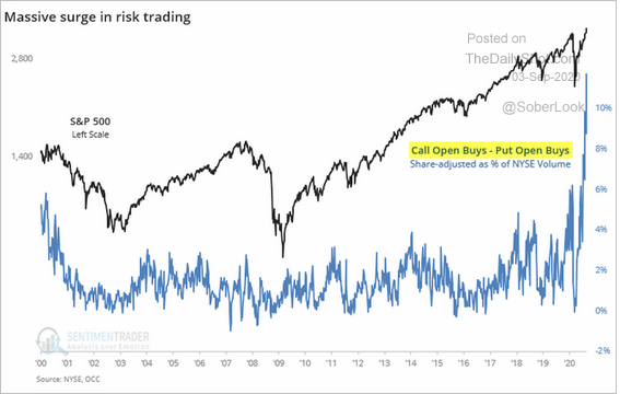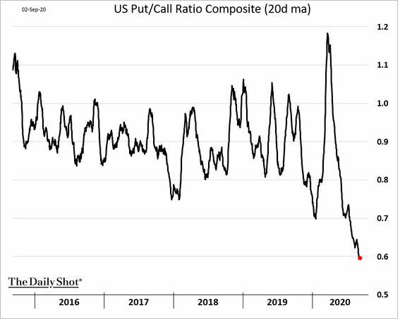 Di seguito due grafici sul rapporto put / call che ve la dicono tutta su come se a marzo 2020 eravamo in una situazione anomala di ribasso ora siamo passati dall’altra parte in una situazione anomala di rialzo: