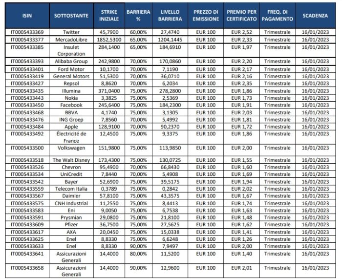 Il pagamento del premio di 2,52 euro in questo caso è condizionato alla performance dell’azione Twitter. Se nel giorno di valutazione il prezzo del sottostante dovesse essere pari o superiore al livello barriera l’investitore percepirà il premio trimestrale. Al contrario, se il valore dovesse essere minore del livello barriera (pari all’60% dello strike iniziale), il certificato non pagherà l’importo. Nel giorno di scadenza del certificato (16 gennaio 2023) l’investitore percepirà il valore nominale del certificato di 100 euro maggiorato dell’ultimo premio condizionato di 2,52 euro qualora il valore dell’azione Twitter (alla data di valutazione finale) dovesse essere pari o superiore al livello barriera (pari a 27,4740). In caso contrario l’investitore subirà una perdita commisurata a quella che avrebbe ottenuto investendo direttamente nell’azione sottostante.