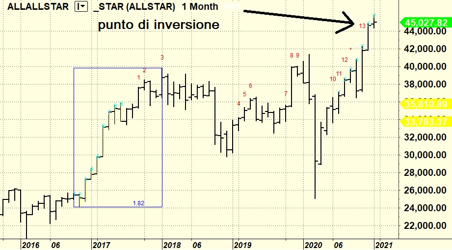 Ho quindi applicato il Sequential ai diversi indici azionari italiani e questo su diversi time frame (barre giornaliere, settimanali, mensili) e il risultato è scoraggiante: se anche gli indici italiani non si possono definire a tendenza rialzista perché come da immagine precedente sono in orizzontale dal 2009 ad oggi (e quindi diciamo che il Sequential non è lo strumento adatto) notiamo in maniera onnipresente l’esaurimento del ciclo rialzista segnalato da un CountDown (conteggio del secondi ciclo di barre) ormai maturo su tutti i time frame (daily, weekly, monthly) ovvero su tutti gli orizzonti temporali. E la cosa è abbastanza inquietante se la si inserisce in un contesto di politica interna dove abbiamo un governo in carica vicino a possibili elezioni, una pandemia ancora in corso, una situazione di finanza pubblica ai limiti della Grecia e poi mi fermo perché non voglio che vi mettiate a piangere. Insomma, se il mercato azionario italiano deve calare o perlomeno continuare a non performare questa è la situazione ideale. E pubblico di seguito forse il grafico più importante quello del Sequential sul Ftse Star italiano, ovvero l’indice meno lesso di tutti gli altri perché impreziosito dalle migliori aziende italiane (no banche ed assicurazioni, please):