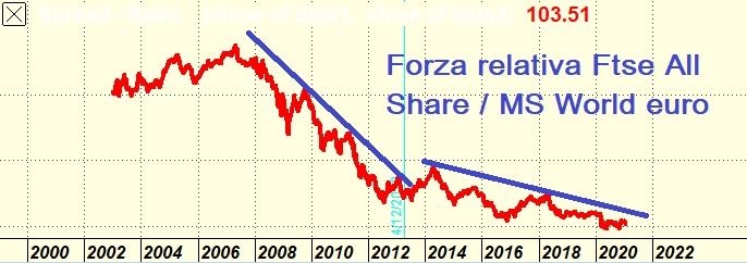 Sostanzialmente io ho perso l’ultimo rialzo di Borsa Italiana e mi sono invece concentrato sulle azioni internazionali. Questo tra le proteste dei lettori che ovviamente vogliono azione italiane anche quando non è il caso, un po’ come cercare le pesche il 3 di gennaio al supermercato. Tranne qualche azione tipo Esprinet non ho fatto davvero molto sull’Italia e la ragione di questa mia ritrosia è banale e assolutamente inconfessabile: la Borsa Italiana non ha rotto nessun massimo, è stata sempre imprigionata in quella gabbia che vedete in qualsiasi grafico mensile. Sostanzialmente noi siamo ancora al livello del 2006 prima della grande crisi. E per capirlo basta plottare il grafico mensile Ftse All Share contro MS World Euro ovvero in termini piani Italia contro il resto del mondo. Il grafico della forza relativa tra questi due indici è scoraggiante perché assomiglia al rotolare di una pallina da ping pong verso il basso e rappresenta la forza del nostro indice rispetto alle Borse di tutto il mondo: