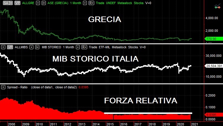 Anzi, c’è un triste paragone che si staglia all’orizzonte e vi mostro una immagine che nessuno di voi vorrebbe vedere ma è così: la forza relativa dell’indice azionario greco con il MIB storico italiano. Se notate la linea rossa in basso (che è il rapporto tra i due indici) è sostanzialmente pari dal 2015 ad oggi e questo significa che dal 2015 ad oggi l’Italia per i mercati è al pari della Grecia. Adesso lo so che inizierete ad andare su tutte le furie ricordandomi che Roma ha conquistato la Grecia 2000 anni fa, che siamo la settima potenza manifatturiera del mondo, la patria della pizza e del mandolino e via andare. Ma questo grafico è semplicemente quello che siamo per i mercati che è quello che conta, non quello che siamo secondo voi o secondo quello che erano gli antichi romani … poi noi tutti ci auguriamo che non sia vero niente e che Tomasini e il suo sequential abbiano preso il più grande granchio della storia. E vi assicuro che sarei felice pure io …