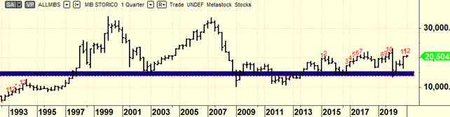 Plotto di seguito un grafico trimestrale del MIB STORICO che ormai propongo ai lettori da quasi 10 anni: il grafico mostra che siamo allo stesso livello del giugno 1986 ovvero sono passati 35 anni e siamo lì … è passata una vita e ci potete andare in pensione con questi 35 anni e non si è mosso niente …