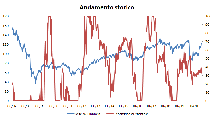Il settore Financials si è staccato dai valori minimi dello Stocastico orizzontale durante il mese di aprile 2019, ma non è mai riuscito a riportarsi stabilmente al di sopra di 50. Con ciò, dimostra di aver avuto, nell’ultimo periodo, delle performance medie, quando va bene, rispetto a quelle degli altri indici Msci settoriali.