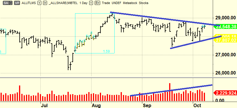 Il nostro indice Ftse All Share sta disegnando un potente doppio minimo. Se fosse distribuzione invece che accumulazione lo vedremmo chiaramente da volumi in calo, mentre i volumi sono palesemente superiori alla media dell’ultimo strappo rialzista. Fin qui tutto bene, quindi, la nostra impostazione di un +30% dell’indice rimane solida. Ottobre è un mese statisticamente negativo per le borse e quindi ci aspettiamo che il movimento orizzontale continui ancora per qualche settimana per poi dare vita al balzo della fine dell’anno. Tecnicamente possiamo notare una trendline ribassista toccata in ormai 4 punti pronta ad essere rotta al rialzo, che sarebbe francamente un segnale assolutamente dirompente: