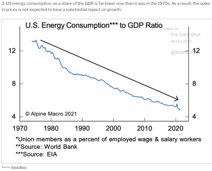 In realtà gli effetti dell’inflazione oggi come oggi sono molto più incerti che negli anni ’70, periodo a cui tutti noi rimandiamo la memoria quando sentiamo parlare di inflazione perché l’economia USA e quella europea sono meno dipendenti di quello che erano allora e il grafico seguente lo dimostra: