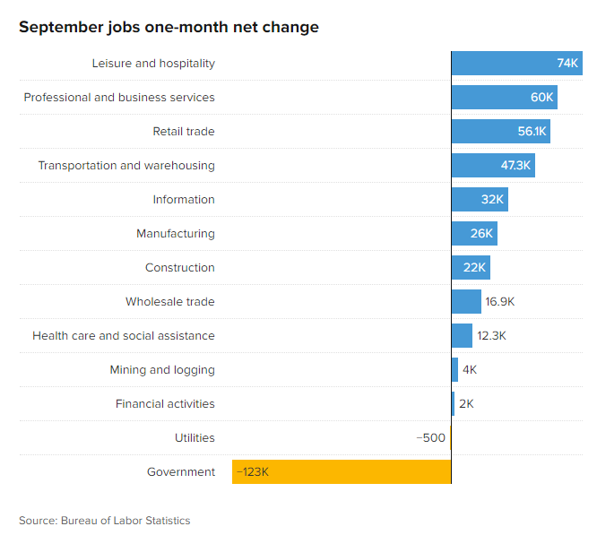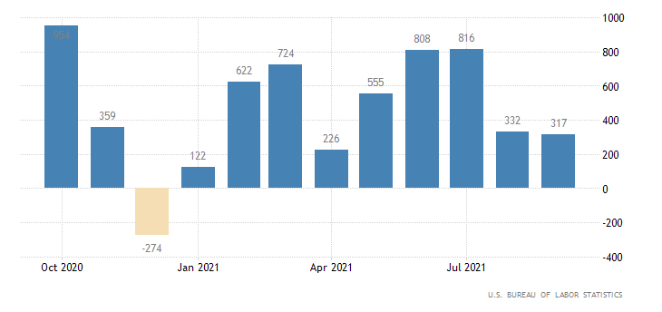 Nuovi occupati molto sotto le attese con il settore pubblico che ha distrutto posti di lavoro per il secondo mese di fila, non che il numero di payrolls più basso dell'anno, anche se la revisione ai mesi precedenti migliora un po' il quadro. A settembre nel settore non-agricolo pubblico sono stati creati solamente 194 mila nuovi posti di lavoro (numero più basso del 2021). Numeri che hanno fortemente deluso il consensus, che dopo il dato di 366 mila di agosto (rivisto da 235 mila) prevedeva un incremento a 500 mila. Nel settore non-agricolo privato i nuovi posti di lavoro a settembre hanno toccato quota 317 mila, anche in questo caso ampiamente sotto al consensus fissato a 455 mila. Nel mese precedente, ad agosto, erano stati creati 332 mila nuovi posti di lavoro (dato rivisto da 243 mila). I due dati sono rilasciati dall’U.S. Bureau of Labor Statistics.
