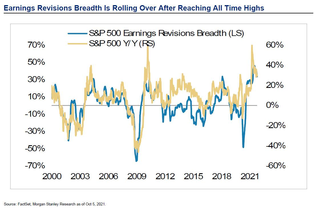 Questa situazione dovrebbe generare una dinamica pervasiva durante la stagione degli utili del 3° trimestre e probabilmente innescherà un ribasso nelle revisioni degli utili a livello dell'indice, un vento contrario per i prezzi. Il prossimo grafico mostra come l’ampiezza della revisione degli utili si sia ribaltata dopo che l’indice S&P500 ha raggiunto i massimi storici: