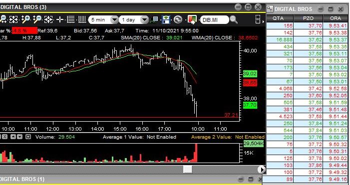 L'errore di cui sopra è certamente grossolano, ma il colpo di scena lo si ha quando sul grafico si vedono cose diverse dagli scambi avvenuti sul time&sales (o viceversa). In mattinata ad esempio guardando il titolo Digital Bros mi sono reso conto che sul chart aveva toccato un minimo a 27.20/27.21 euro (linea orizzontale rossa) mentre sul time&Sales quel valore non esisteva proprio !
