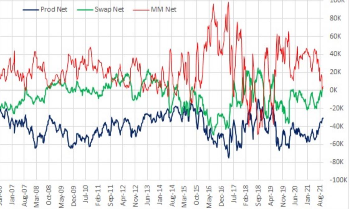 L'aspetto interessante che può far pensare ad una ripresa dei corsi deriva dall'analisi delle posizioni assunte dai produttori -linea blu- che utilizzano la commodity e che tendono a comprare sui ribassi e a vendere sui rialzi rispetto ai money market rappresentati dalla linea rossa (fondi e portafogli di investitori) che hanno capitolato nel recente ribasso. I produttori tendono infatti a calmierare l'andamento del sottostante essendo insiders e conoscendo meglio di chiunque altro il sottostante.