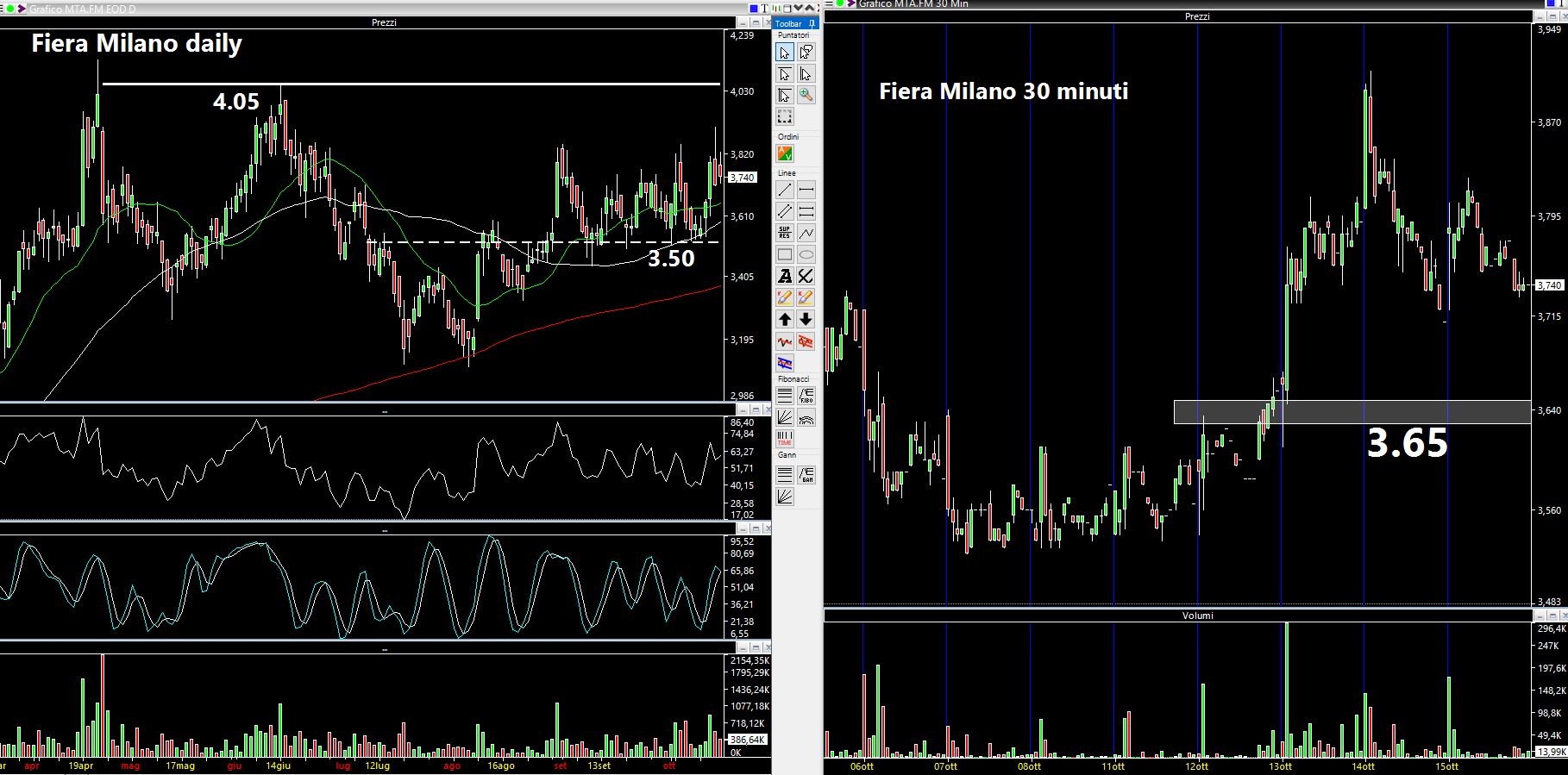 Boom e sboom (in intraday): rottura secca di 3.80 con massimo poco dopo a 3.90 (+2.6%) e poi classico ritracciamento al punto di partenza. Per ora ha cercato di sfondare 3.85 ma deve chiudere sopra tale livello. Come avevo già scritto è il classico titolo che forza determinate aree e poi ritraccia. Al momento l'ideale è che rimanga sopra l'area 3.65 con uno stop sotto 3.50 market on close.