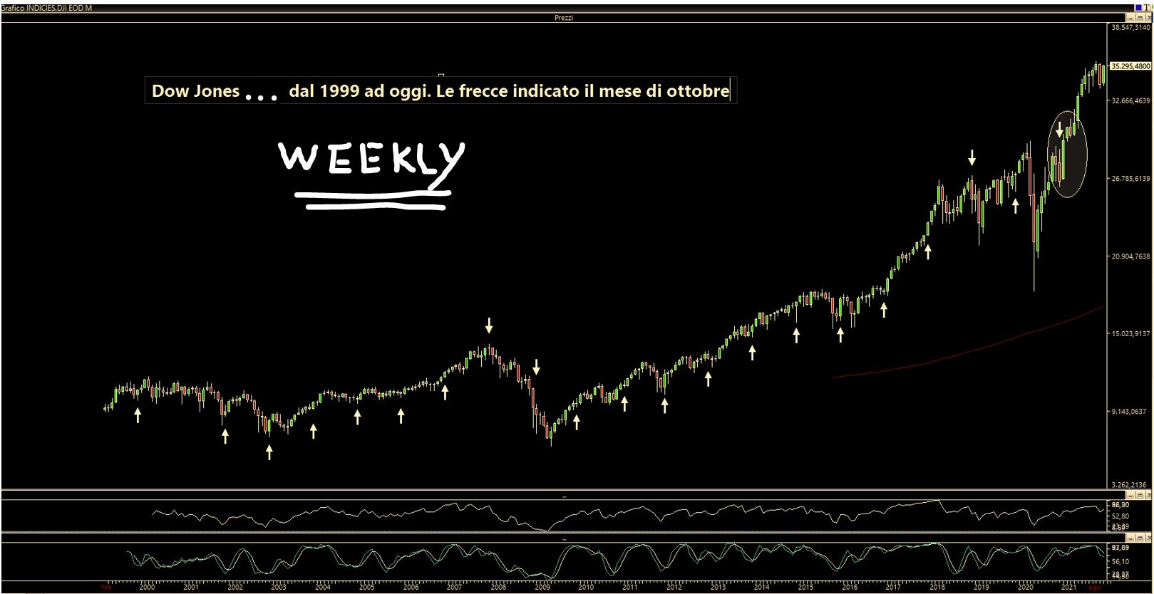 Nel grafico seguente ho indicato una stagionalità interessante sull'indice Dow Jones dal 1999 all'anno scorso, ma potrei andare molto più a ritroso nel tempo, fidatevi. Come vedete ci sono delle frecce in su e pochissime in giù. Ciascuna di loro si riferisce all'andamento del mese di ottobre (e a seguire dei mesi successivi). Notiamo un'enorme abbondanza di frecce verso l'alto rispetto a quelle verso il basso che però, quando si sono verificate, hanno portato a grosse perdite sul mercato nello stesso mese o in quello immediatamente successivo (ottobre 2018, oppure ottobre 2008....oppure ottobre 1987) . Solo a ottobre 2020 abbiamo avuto un mese negativo che però è stato letteralmente spazzato via da quello di novembre, ma il 2020 è stato un caso in cui si è andati al di fuori delle code della gaussiana e quindi ci può stare (cerchio grigio a destra presente nel grafico): tutto sommato anche in questo caso si sono poste le basi per una bella salita successiva.