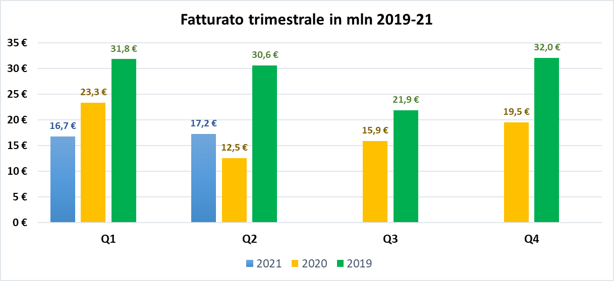 Il secondo trimestre del 2021 ha finalmente segnato la prima inversione di tendenza dei ricavi a partire dall’inizio della pandemia: sono stati registrati € 17,2 mln vs € 12,5 mln del 2020 (+37,4%). La crescita, seppur molto vigorosa, NON è stata sufficiente a consentire il ritorno ai livelli pre-crisi: nel 2019, infatti, RATTI aveva fatturato nel medesimo periodo ben € 30,6 mln.
