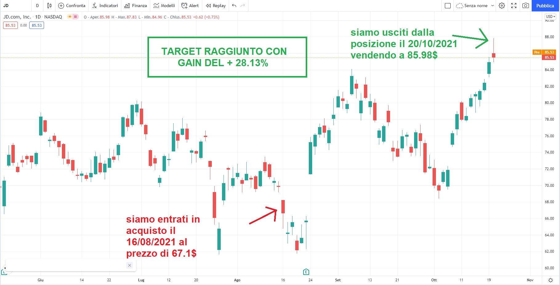 Come potete notare dal grafico siamo entrati in posizione lo scorso 16/08/2021 ad un prezzo di 67.1$ e siamo usciti nella giornata di ieri 20/10/2021 liquidando la posizione a 85.98$.