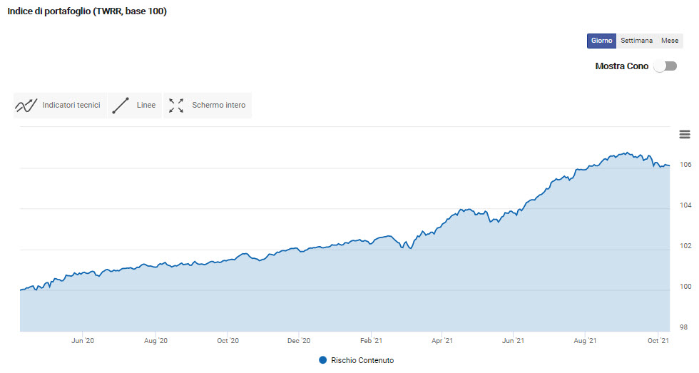 L’equity line del servizio Portafoglio Rischio Contenuto aggiornata al 13 ottobre 2021: