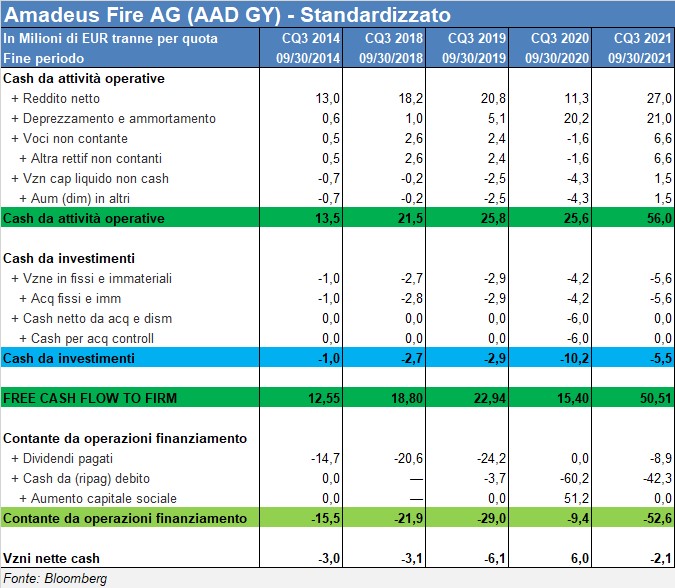 Il core business di AMADEUS FIRE ha generato, nei primi nove mesi ben € 56 mln. A fronte di ciò, l’assorbimento di liquidità dall’area Capex si è mantenuta molto contenuta (€ 5,5 mln).