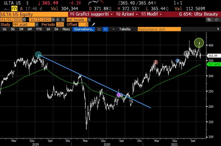 ULTA BEAUTY ha riportato una severa flessione delle quotazioni (-8,45%): le cause? Il mercato è rimasto deluso dai target di lungo termine dichiarati dal management. In effetti, la crescita stimata non evidenzia tassi esaltanti.