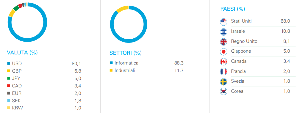 Il settore maggiormente rappresentato all’interno dell’indice, ovviamente, è quello dell’informatica, seguito dai beni industriali. I principali paesi in cui si concentra l’investimento sono Stati Uniti, Israele e Regno Unito.