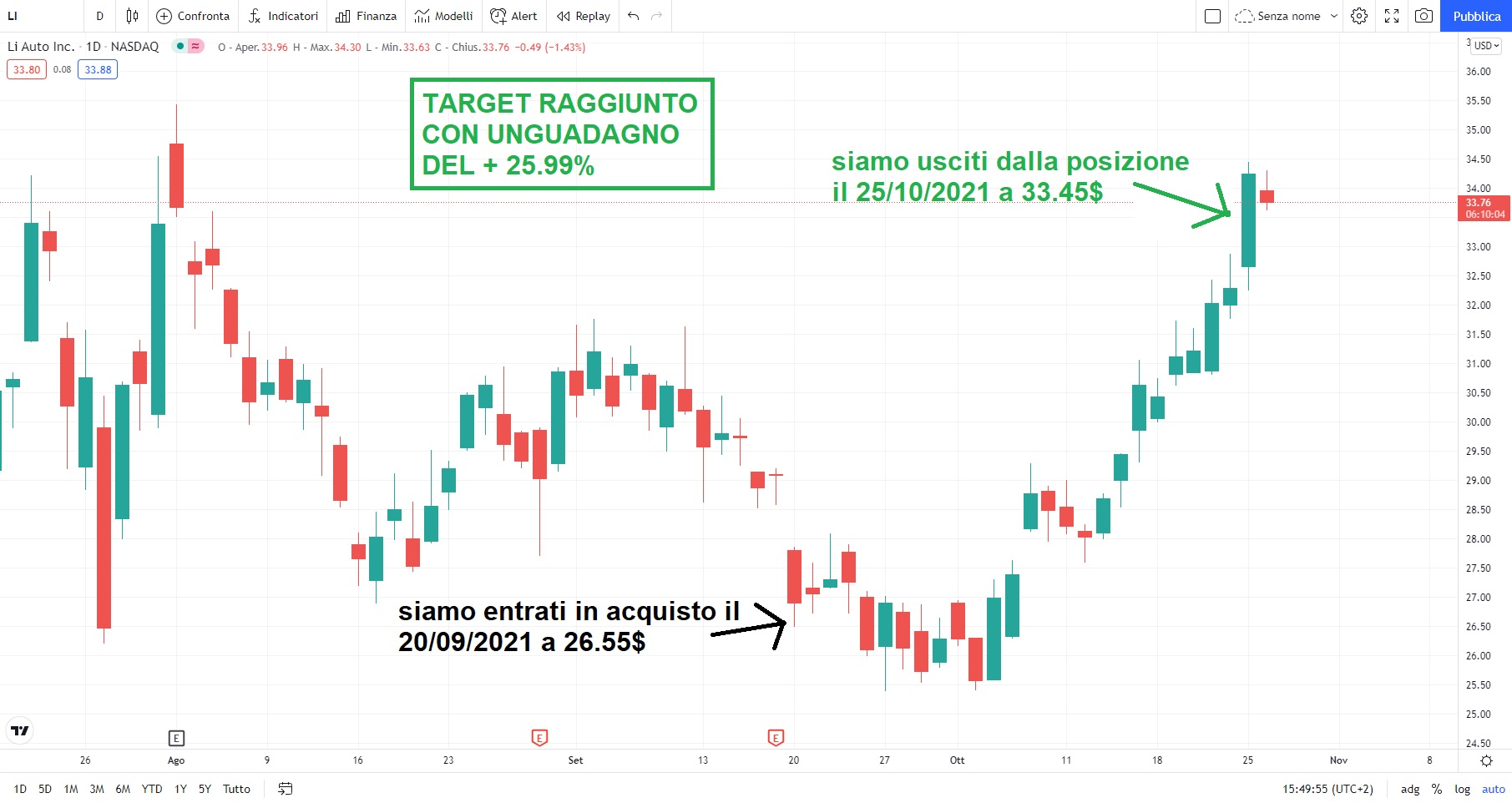 Come potete vedere dal grafico siamo entrati in acquisto il 20/09/2021 ad un prezzo di 26.55$ e siamo usciti dalla posizione con un eseguito totale nella giornata di ieri 25/10/2021 ad un prezzo di 33.45$.