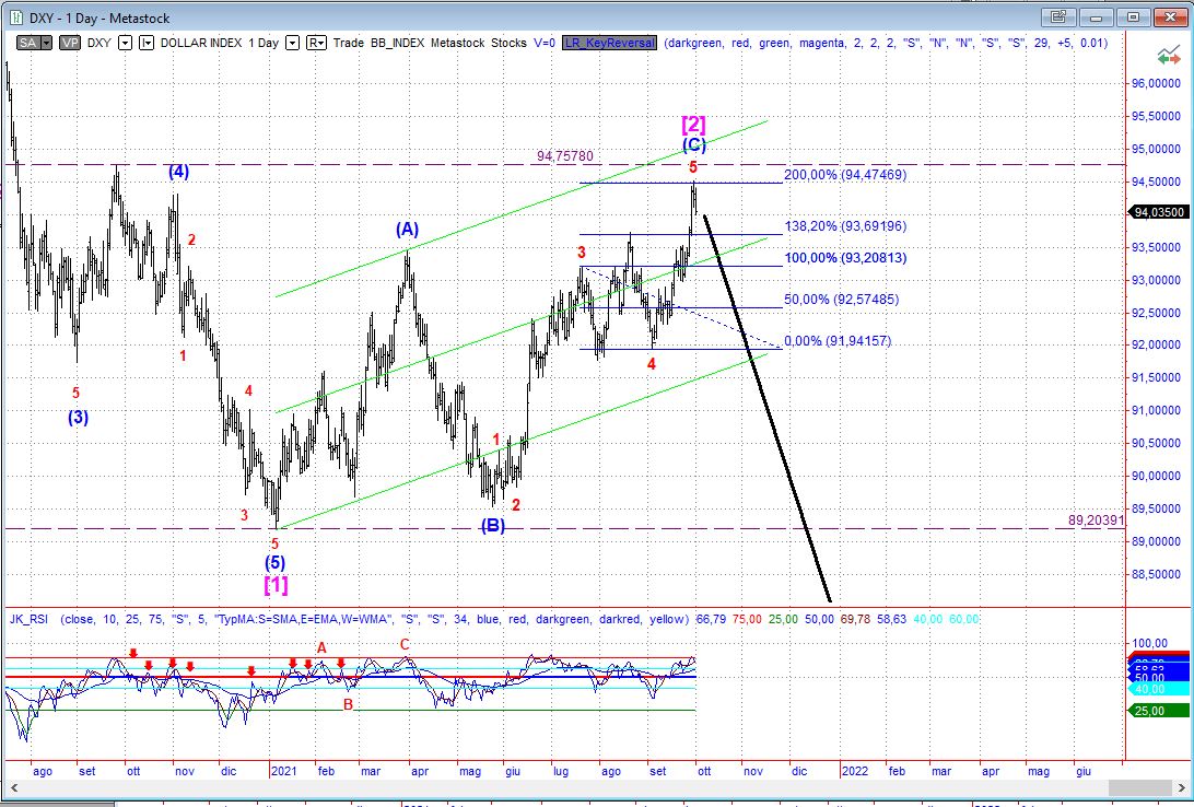 Sul Dollaro ci siamo messi short, ma l’onda [2], all’ultimo ha deciso di allungare verso il target successivo del 200%. In ogni caso il modello ribassista non è negato e la chiusura di venerdì fa ben sperare, per cui non chiudiamo a posizione e vediamo se la prossima settimana si rimette in carreggiata.