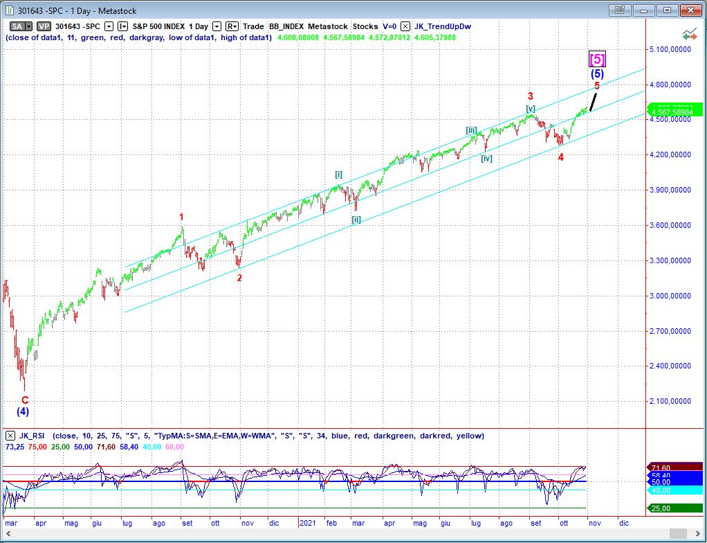 La settimana si chiude con gli indici americani nuovamente allineati al rialzo. Il Dow Jones ha segnato il suo massimo a 35.892 punti nella giornata di martedì andando poi a correggere nelle sedute successive. Se quello fosse il massimo finale dovremmo leggere questa correzione come un 1-2 di un cinque onde ribassista (leggibile su time frame a 30 minuti). Se al contrario si traccia il canale di terminazione di Elliott della sola ond a(5) congiungendo i minimi di onda 2 e 4 e tirando la return line parallela in modo che passi per il massimo di onda 3 allora vediamo che per raggingere almeno la mediana di questo canale (obiettivo minimo di onda 5) il dow dovrebbe salire un altro pò portandosi intorno ai 37.000 punti. Per analogia il Nasdaq dovrebbe raggiungere e testare la trendline superiore del canale in area 16.350-16.500 e l’S&P500