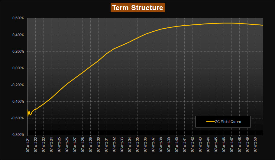 La lettura della ZC-Yield Curve mostra un deciso rialzo dei rendimenti sia sul tratto a medio sia sul tratto a lunga rispetto alla scorsa analisi. Il rendimento della scadenza a 10 anni recupera di gran carriera l’area positiva, attestandosi allo 0,17% rispetto al precedente -0,04% mentre la scadenza trentennale torna sopra lo 0,50% rispetto al precedente 0,30%. Anche la curva modifica lievemente la sua struttura, con la parte a breve e medio che appare ora più ripida, mentre rimane appiattita quasi completamente sulle scadenze lunghe. La curva evidenzia ora un massimo di rendimento sempre sulle scadenze 2046-2047, in aumento rispetto alla scorsa rilevazione, passando all’attuale area 0,54% dal precedente 0,33% di rendimento. Salgono anche i tassi forward su Euribor 6 mesi, con il tratto a medio che si inclina positivamente in modo netto e deciso, come non si vedeva da tempo immemore. Ora la curva fornisce previsione di tassi positivi dal 2025 rispetto al 2027 della precedente rilevazione, e con il tratto a lunga che si riporta in area 1,00%.