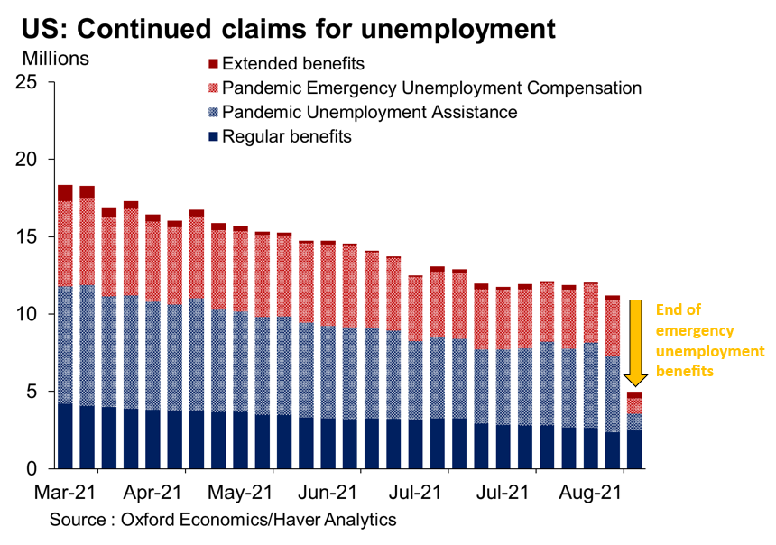 Ora i sussidi straordinari sono definitivamente scaduti, cosa che, come mostra il seguente grafico di Oxford Economics, potrebbe avere un impatto negativo su reddito, consumi e confidence, se effettivamente le assunzioni non aumentano, come i recenti numeri sembrano indicare.