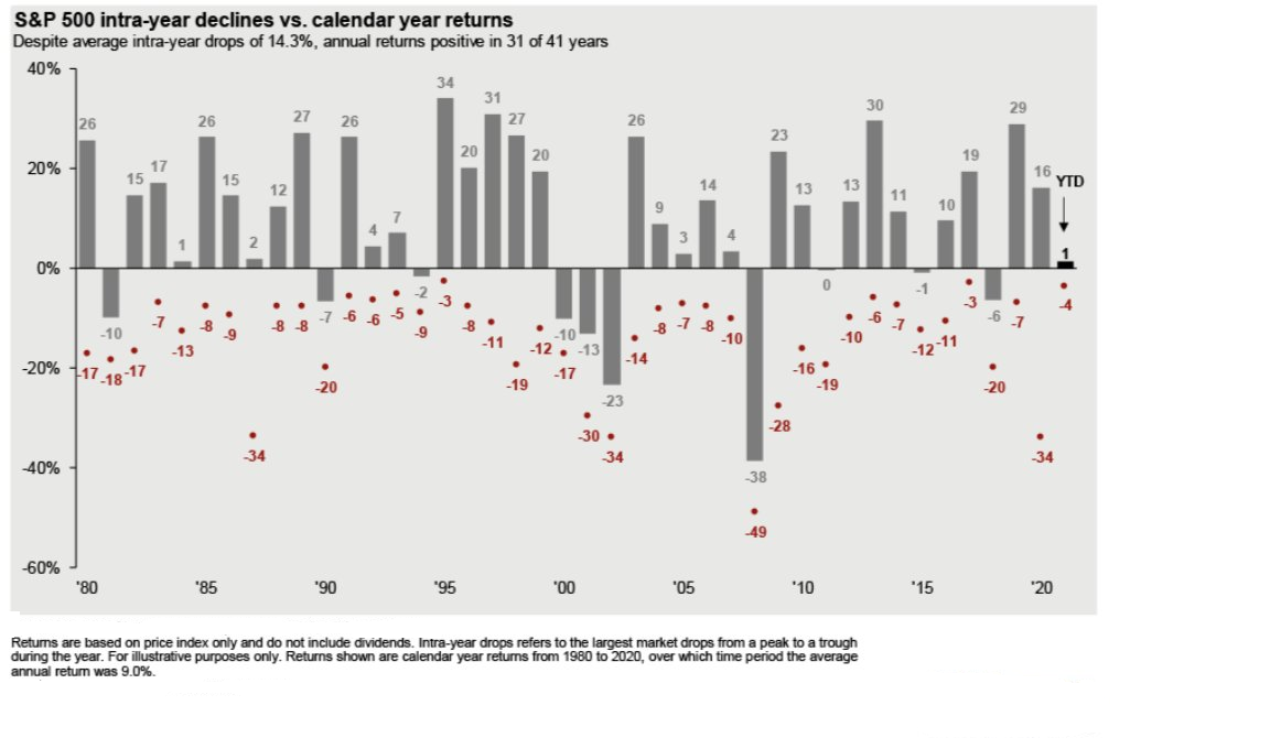 Finalmente una fase correttiva degna di questo nome, anche se, come mostra il seguente grafico, di norma le correzioni sono ben superiori, e solo nel 1996 e nel 2017 degli ultimi 41 anni non hanno mostrato una correzione superiore al -5% (e quest'anno fino a ieri), come visibile da seguente grafico: