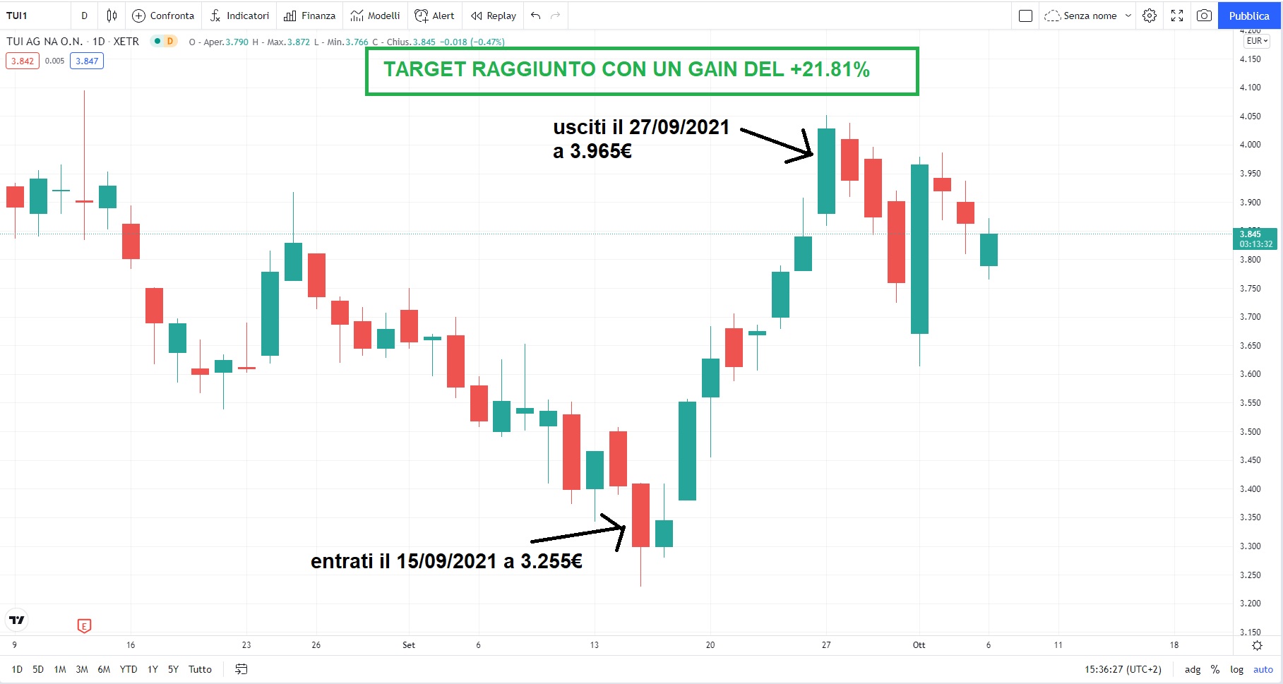 Siamo entrati in acquisto il 15/09/2021 ad un prezzo di 3.255€ e siamo usciti dalla posizione il 27/09/2021 liquidando la posizione a 3.965€, raggiungendo il target con un gain del +21.81%.