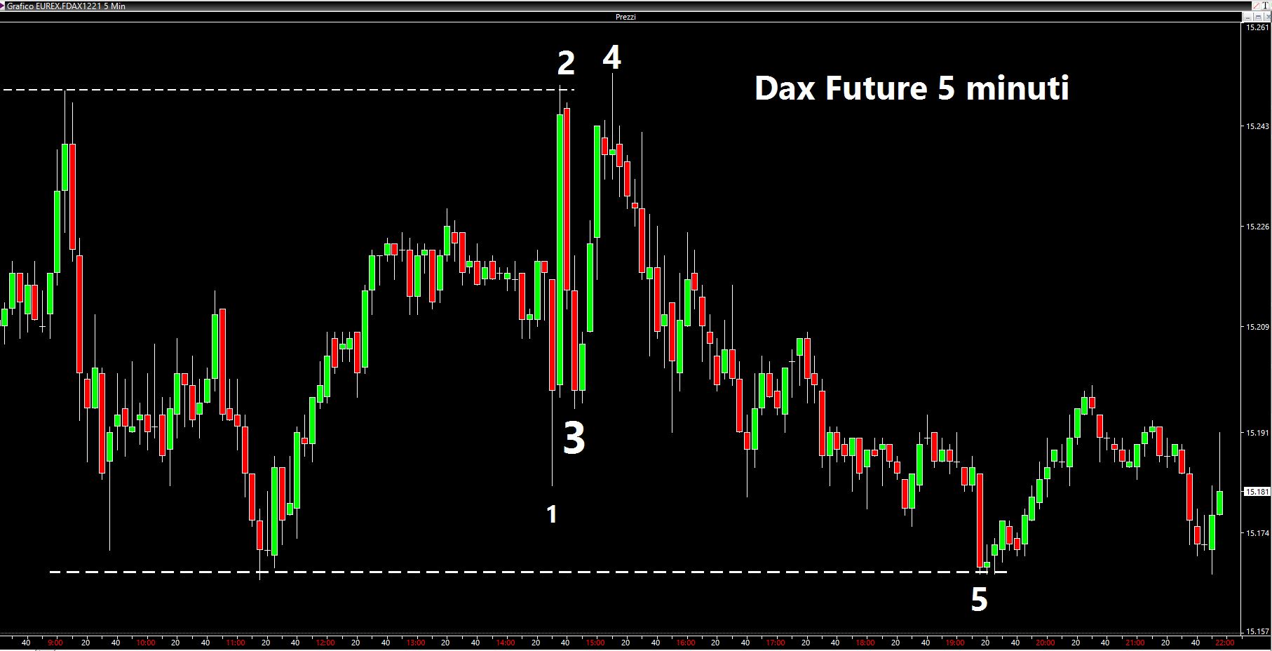 Mentre nel lungo periodo la situazione americana assomiglia ad un grande rettangolo (se di accumulazione o distribuzione lo si vedrà) i problemi rimangono per l'operatività intraday: repentine salite si alternano a repentine discese spesso senza alcun senso ma dettate semplicemente da algoritmi in cerca spasmodica di liquidità. Un esempio lo abbiamo avuto ieri in occasione della pubblicazione dei dati sul lavoro, con un future Dax che prima è sceso (punto 1 del grafico seguente), poi ha invertito bucando al rialzo quelli che fino a quel momento erano stati i massimi di giornata (punto 2) poi è nuovamente sceso sui minimi di barra (punto 3). Come se non bastasse si è riportato per l'ennesima volta sui massimi di giornata bucandoli (punto 4) e nel prosieguo della seduta è andato a ribucare i minimi, complice una Wall Street non entusiasmante (punto 5).