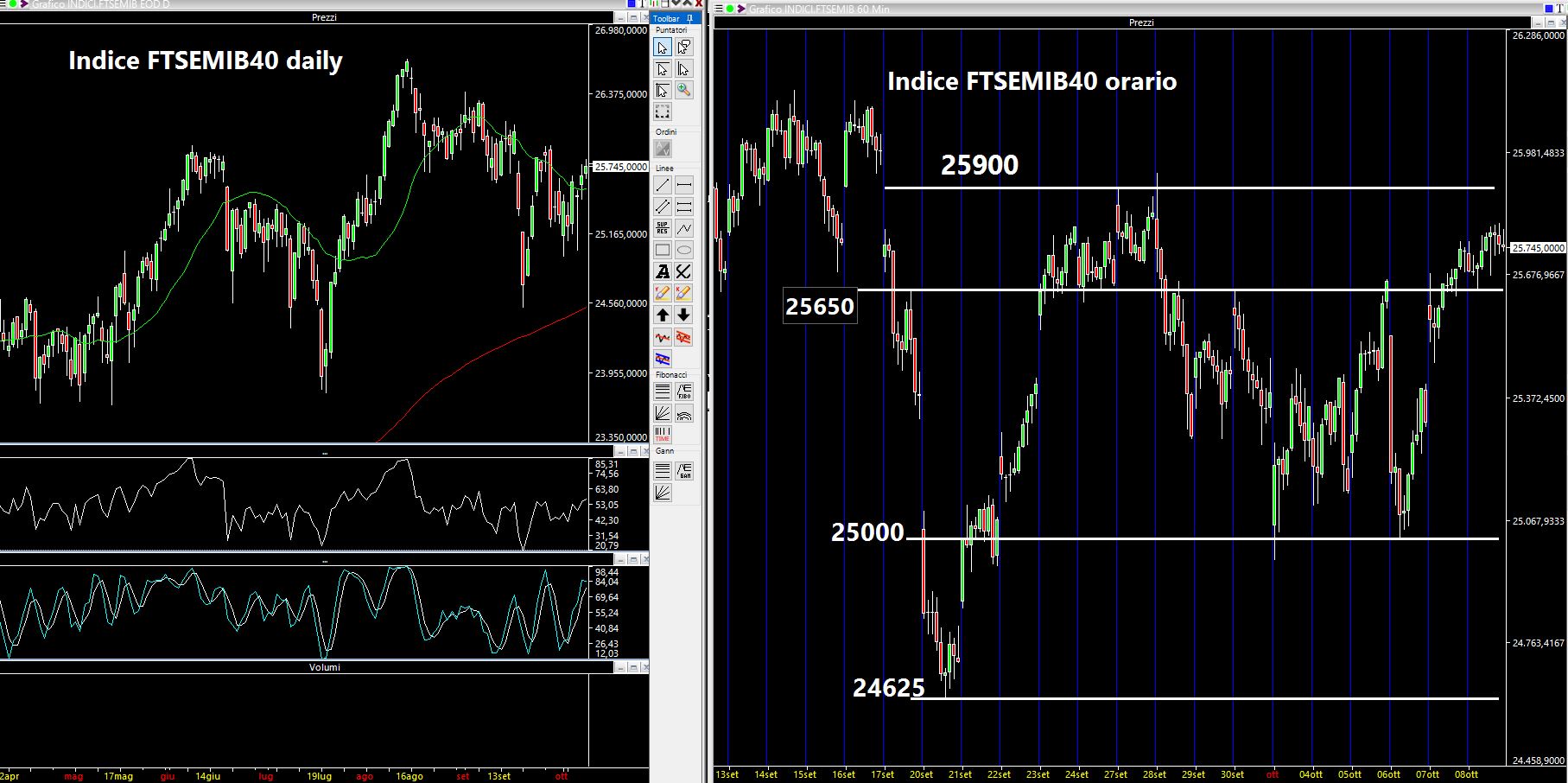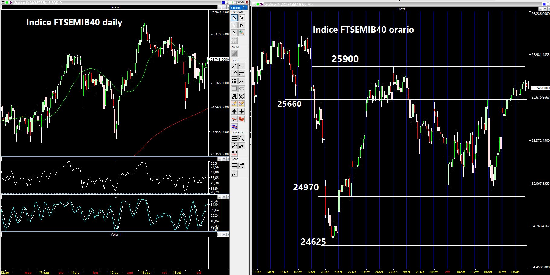 Sostanzialmente sempre gli stessi: 25900, 25650 e poi i 25000 con estremo a 24625. Attenzione che continuiamo ad essere nella terra di nessuno quindi per il momento non mi aspetto ancora alcun movimento impulsivo né all'insù né all'ingiù. Ricordo poi che il mercato statunitense sarà parzialmente chiuso nella giornata di lunedì 11 Ottobre per la festività del Columbus Day.