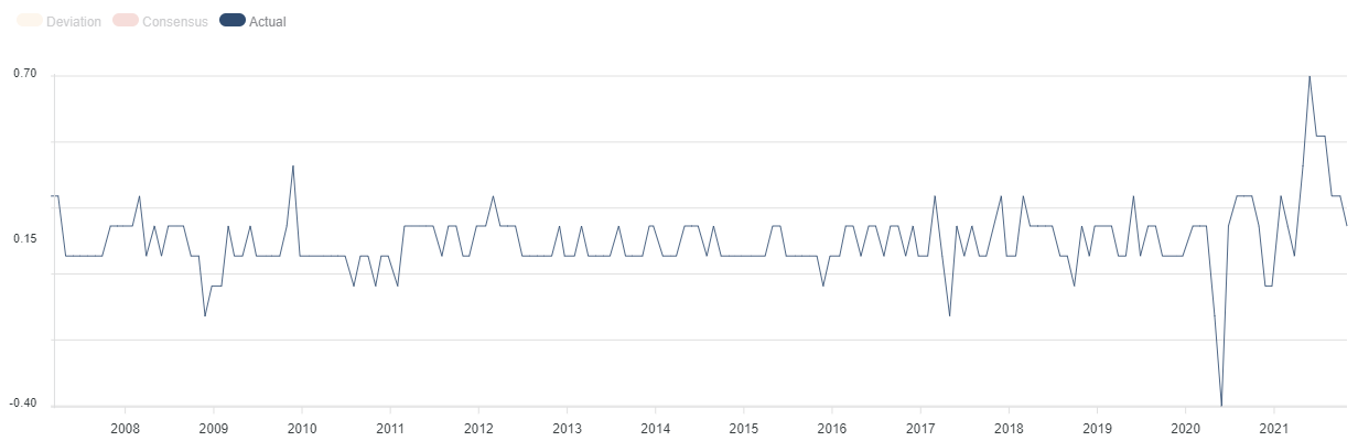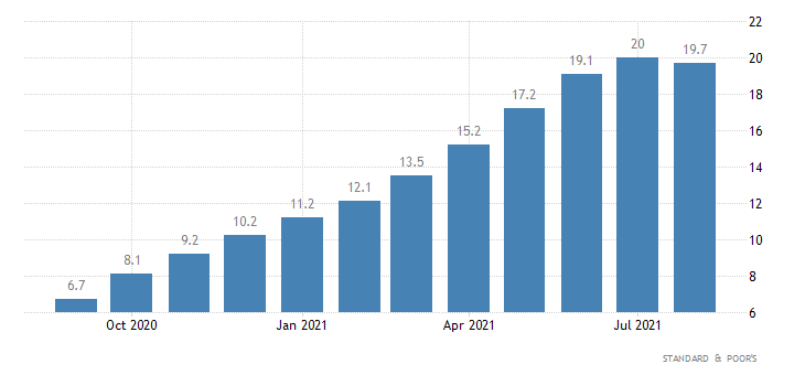 L’S&P CoreLogic Case-Shiller 20-city Home Price Index valuta le variazioni nel valore del mercato immobiliare residenziale in 20 regioni degli USA. A livello annualizzato ad agosto è cresciuto del 19,7%, rialzo di poco inferiore a quello del mese precedente del 20% (rivisto da 19,9%). Il dato a livello mensile sempre di agosto, invece, registra un +0,9%, rallentando rispetto al +1,5% di luglio.