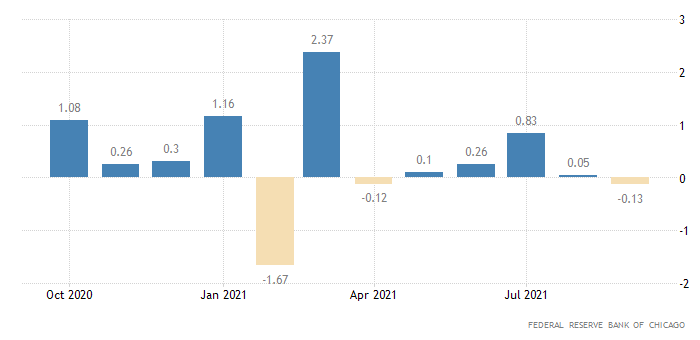 Il Chicago Fed National Activity Index (un'aggregazione di 84 dati macro del mese), indice mensile rilasciato dalla Federal Reserve Bank di Chicago e che stima l’attività economica generale e le pressioni inflazionistiche correlate, ha deluso parecchio a settembre registrando una contrazione di 0,13 punti. Ad agosto era a 0,05 punti (rivisto da 0,29).