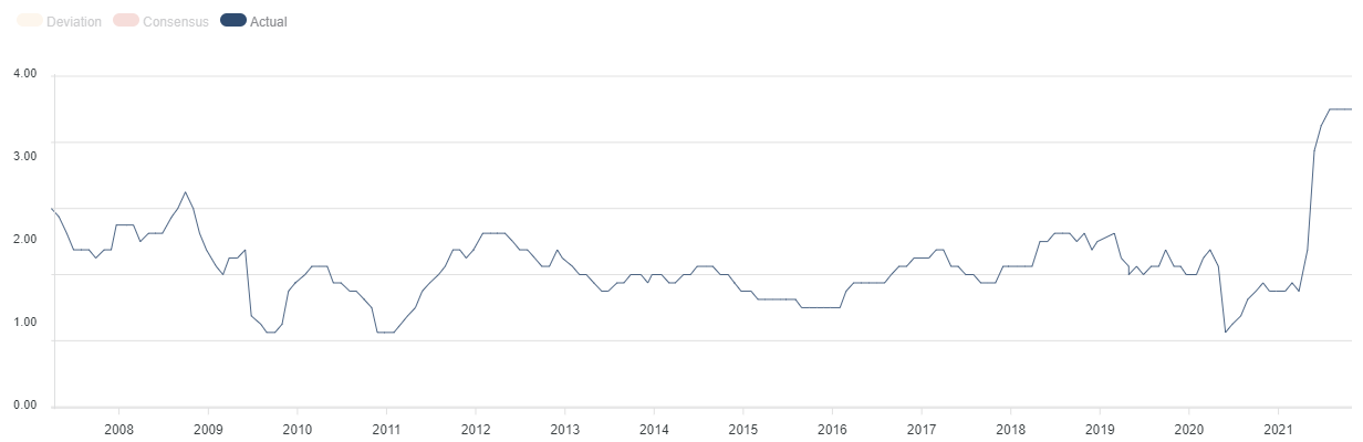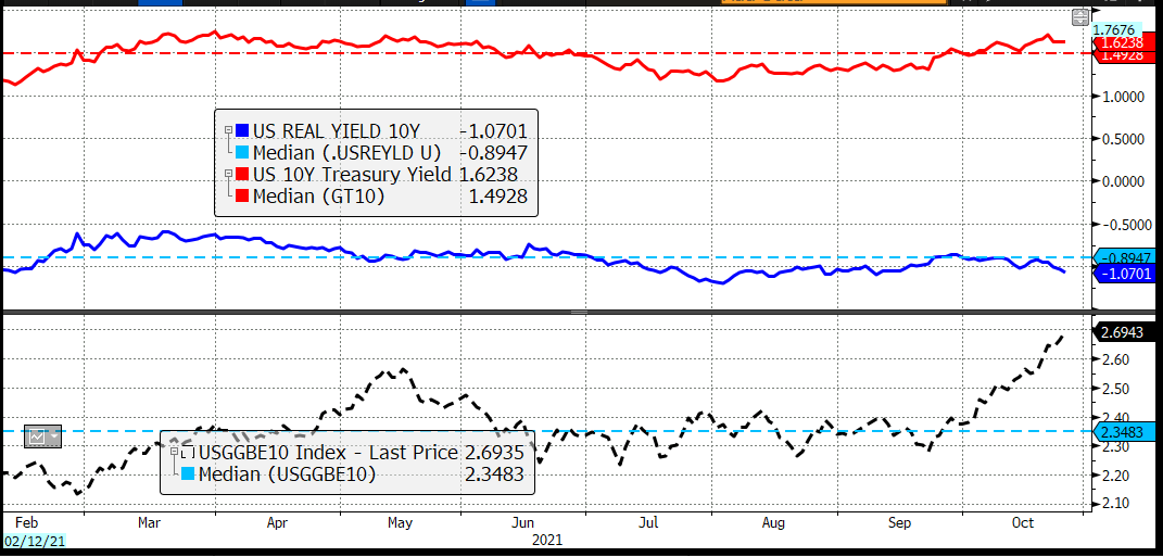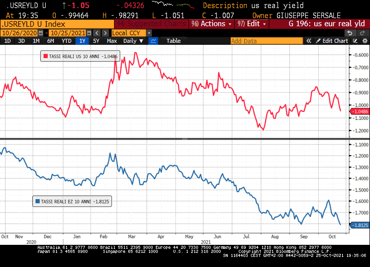 Mentre per quanto riguarda la Banca Centrale Europea, l’annuncio della Lagarde, a margine della riunione sui tassi, circa la decisione di comunicare la fine del PEPP a Marzo 2022 già in questa riunione senza attendere quella di dicembre, ha prodotto come risultato che i tassi reali, che erano crollati ai minimi storici di -1.81% sul 10 anni, hanno recuperato 11 bps con i tassi nominali stabili.