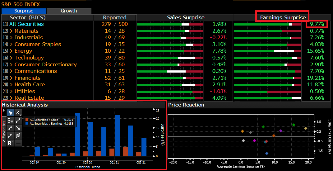 Ma in generale la stagione delle trimestrali continua a mostrare un andamento molto positivo, con oltre l'80% delle aziende a battere le stime per i dividendi ma, come segnalato negli articoli delle scorse settimane, la sorpresa media non è più a 2 cifre (vedi grafico sotto) il che è un peggioramento rispetto agli scorsi trimestri (riquadro in basso a sinistra del grafico):