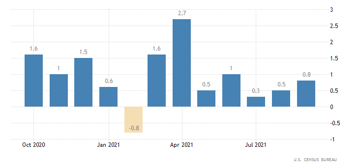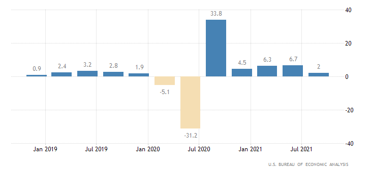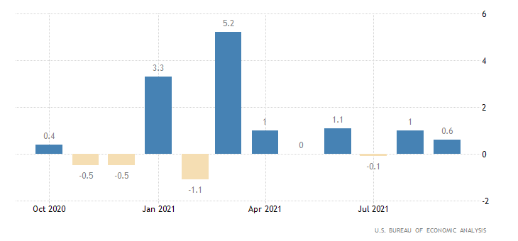 Il dato preliminare del PIL annualizzato nel terzo trimestre (prima stima) registra un +2%, crescita più lenta rispetto a quella prevista dal consensus, fissato a +2,7%. Evidente il bel rallentamento anche rispetto al secondo trimestre dell’anno, quando era stato realizzato un +6,7%. Se non altro i consumi hanno sorpreso in positivo e avrebbero potuto far meglio senza la scarsità dei semiconduttori che ha limitato, ad esempio, le vendite di auto. Le scorte hanno dato un bel contributo (2.1%) cosa che è negativa in quanto lo smaltimento peserà sui trimestri a venire. Il dato è rilasciato dall’U.S. Bureau of Economic Analysis.