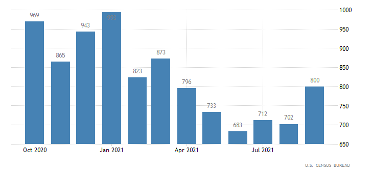 A settembre il numero di nuove case vendute si attesta a quota 800 mila, numero più alto da aprile ad oggi e più alto del consensus fissato a 760 mila. Ad agosto il dato si era fermato a quota 702 mila (dato rivisto da 740 mila). Il dato è rilasciato dall’U.S. Census Bureau.
