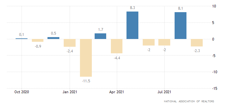 Il dato mensile relativo ai contratti pendenti di vendita di abitazioni, indicatore basato su contratti immobiliari firmati per abitazioni già esistenti, a settembre segna un -2,3%. Ad agosto era stata registrata una crescita dell’8,1%. Il dato è rilasciato dalla National Association of Realtors.